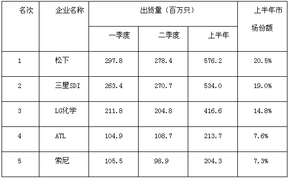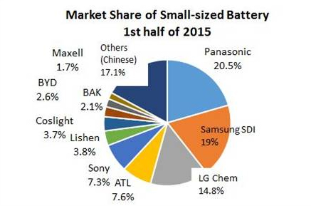 根据韩国市场分析机构SNE对2015年上半年全球小型锂离子电池主要企业出货量的统计分析,日本松下以5.762亿只的出货量稳居第一,韩国三星SDI以5.34亿只居第二,LG化学以4.166亿只占据第三,中国ATL小幅领先索尼排名第四,索尼屈居第五。这主要是由于TESLA对松下圆柱型电池的需求增加,而手机和笔记本电脑用电池正在向软包装电池转换所致。2015年上半年主要企业市场份额如图一,前五大企业的出货量见表一。