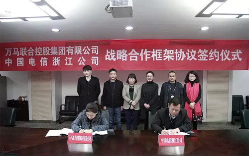 图为万马联合控股集团副董事长张珊珊与中国电信浙江公司总经理卢耀辉