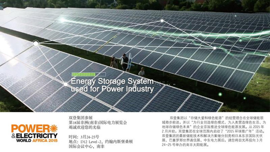 2015年3月24-25号,“大数据时代领先的绿色储能集成服务供应商”双登集团来到非洲大陆最南端,参加在南非城市约翰内斯堡举办的2015年非洲电力能源展(The solar show africa 2015),这是双登集团继成功参展东京光伏展、中东电力展、巴塞罗那世界通信大会后,2015“环球推广年”活动的第四站。通过参加重量级的国际行业展会,双登集团将带着自己最新的产品、技术、功能更为完善的新能源储能系统解决方案走出国门,为全球各地用户提供新的绿色能源应用方式。