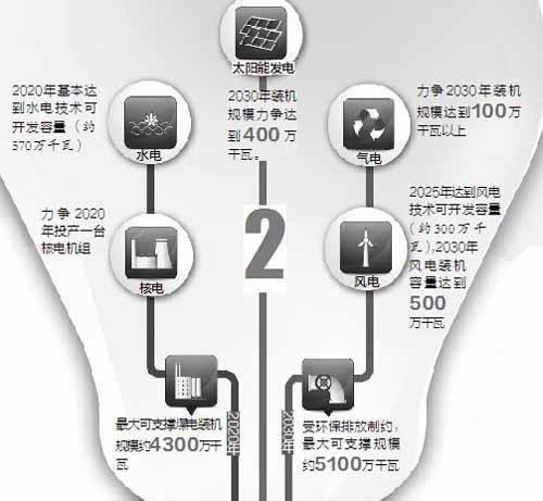 根据规划,江西省将进一步挖掘水电装机潜力,2020年基本达到水电技术可开发容量(约570万千瓦),同时积极推动抽水蓄能电站建设;核电方面,江西省将密切跟踪国家内陆核电政策,力争2020年投产一台核电机组;气电方面,江西将根据非常规天然气资源开发情况适时启动天然气分布式发电建设,力争2030年装机规模达到100万千瓦以上;风电建设方面,江西将加快风能资源的分散开发利用,2025年达到风电技术可开发容量(约300万千瓦),随着低风速发电技术的成熟和推广,2030年风电装机容量有望达到500万千瓦;鼓励建设分布式太阳能光伏发电系统,2030年装机规模力争达到400万千瓦。