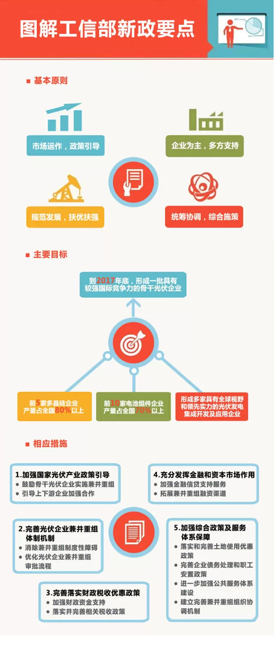 原文件略长,小编十分贴心的想到大家都是无耐心星人,所以特制了一张图来分解意见中的要点。小伙伴们看下图即可轻松读懂长篇政策。有耐心的小伙伴儿请戳此链接查看新政全文:《工信部关于进一步优化光伏企业兼并重组市场环境的意见》。
