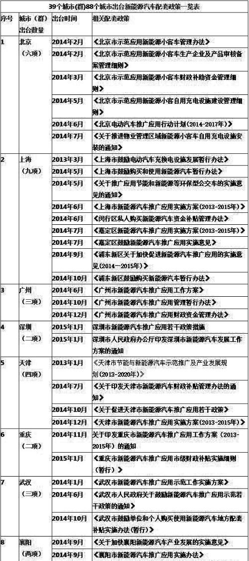 以下为39个城市(群)88个城市新能源汽车配套政策一览表