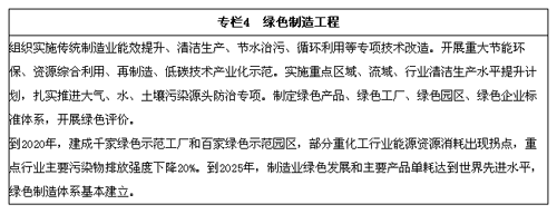 加大先进节能环保技术、工艺和装备的研发力度,加快制造业绿色改造升级;积极推行低碳化、循环化和集约化,提高制造业资源利用效率;强化产品全生命周期绿色管理,努力构建高效、清洁、低碳、循环的绿色制造体系。