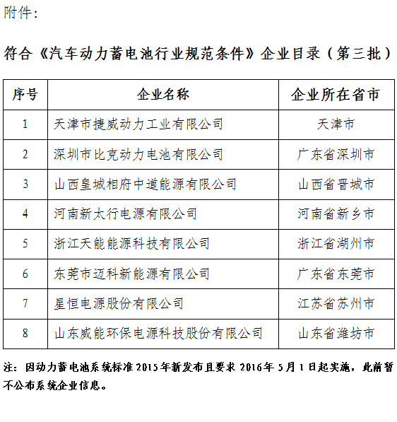 根据专家审查意见,现将符合《汽车动力蓄电池行业规范条件》企业目录(第三批)予以公示。如有异议,请于2016年4月19日前以书面传真或电子邮件形式反馈至部装备工业司汽车处(传真:010-66013708;电子邮箱:chencm@miit.gov.cn)。