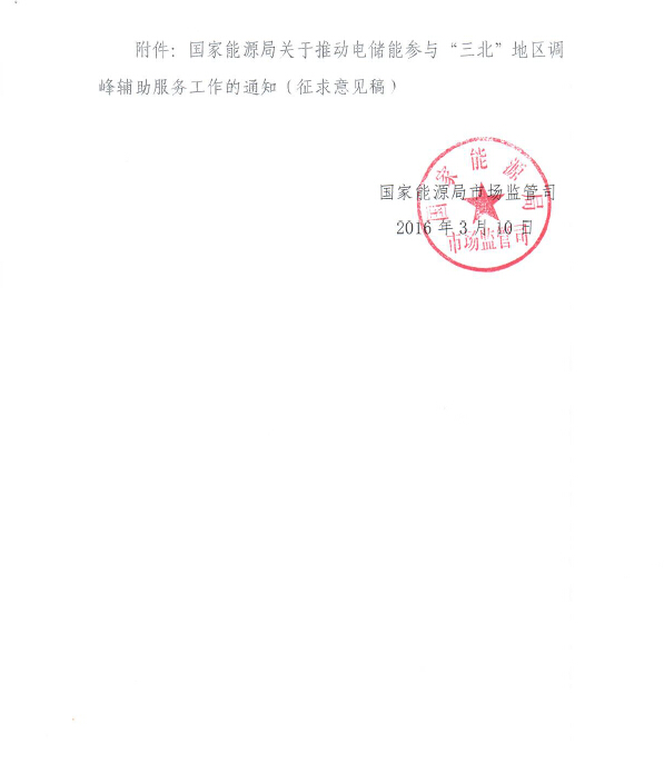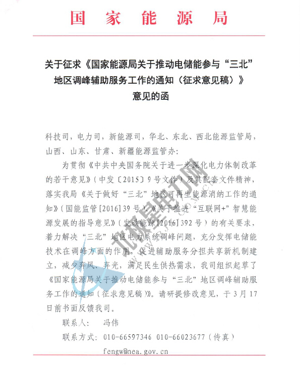 近日记者获悉,为贯彻《中共中央国务院关于进一步深化电力体制改革的诺干意见》及其配套文件精神,落实国家能源局《关于做好“三北”地区可再生能源消纳工作的通知》、《关于推进“互联网+”智慧能源发展的指导意见》的有关要求,着力解决“三北”地区电力系统调峰问题,充分发挥电储能技术在调峰方面的作用,减少弃风、弃光,满足民生供热需求,能源局市场监管司起草了《国家能源局关于电储能参与“三北”地区调峰辅助服务工作的通知(征求意见稿)》。