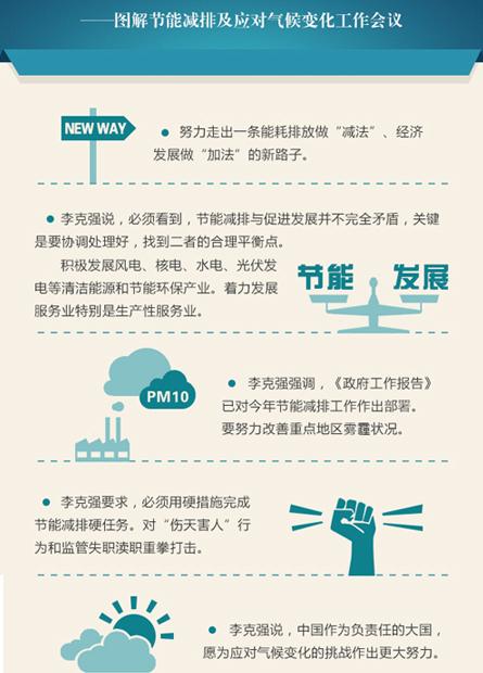 李克强强调,《政府工作报告》已对今年节能减排工作作出部署。要加强政策引导,更多引入和运用市场机制,推进工业、建筑、交通运输、公共机构等重点领域和重点单位节能,加大污染特别是大气污染治理,努力改善重点地区雾霾状况。建立和实施能效“领跑者”等制度,增强全社会特别是企业节能减排的内在动力。