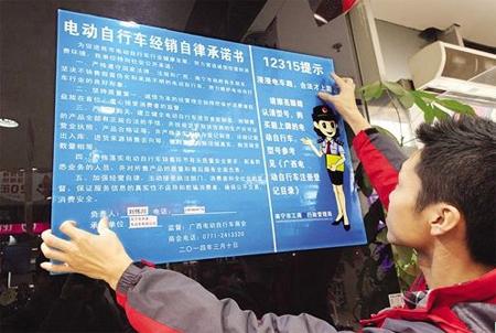 近日,广西南宁市内34家电动车经销商获权挂起“自律承诺书”牌匾,郑重向社会承诺:不销售假冒伪劣和来路不明电动车,并对产品质量和售后服务全面负责。