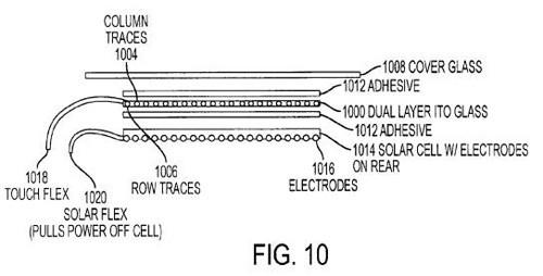 在新专利中,其中一项技术是将太阳能电池背向触摸感应元件或显示屏放置,这种设置的原理是通过其他的方式将光线引导进入感光元件,并且可以在设备的内部使用光纤材料使光线的方向得到改变。