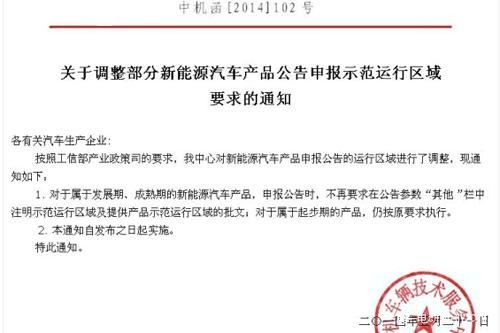 5月21日,中机车辆服务中心发布了《关于新能源汽车产品申报公告运行区域进行调整的通知》(以下简称《通知》)。该《通知》中提到,按照工信部产业政策司的要求,对于属于发展期、成熟期的新能源汽车产品,在申报公告时,不再要求在公告参数“其他”栏中注明示范运行区域及提供产品示范运行区域,但对于属于起步期的新能源汽车产品,仍按原要求执行。