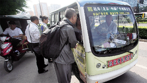 因电瓶车存在无照运营以及安全问题,近日,朝阳区多个街道的社区摆渡车突然被叫停,但其他区县街道为保证市民出行便利,仍在开行摆渡车。北京市交通委11日透露,北京将力争在年底推出6米长可以刷卡消费的“超袖珍”电动公交,解决社区摆渡车问题。