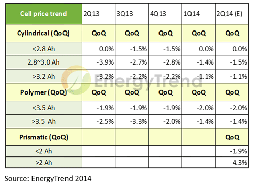 圆柱型电池:受到产线转移、供给减少的影响,电池芯价格开始止跌,甚至有局部吃紧现象,但考量到品牌厂对于第二季的采用量季成长并不特别明显,报价仍以持平居多。低容量电池芯连续两季维持US$0.65/Ah,价格上涨指日可待;而高容量电池芯则略微下滑,但价格跌幅收敛在2%以内。