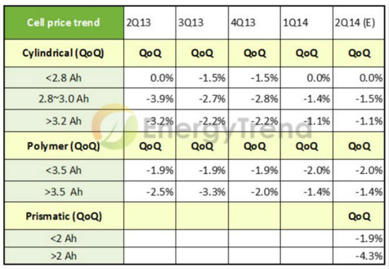 高分子电池: 由于第二季新机种出货量不高,高分子电池价格依然下滑。尽管中国生产电池芯供给量增加,但因质量因素大多停留在山寨与白牌的智能手机与平板,对于一线品牌的高分子电池价格影响不大,第二季价格跌幅约在1.5-2%。