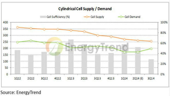 轻薄笔记本电脑则是近来消费性电子市场的关注焦点,随着薄型零组件的平价化,2014年薄型电池的渗透率已从2013年的8%提高至22%,带动方型电池与高分子电池的需求持续走高。另一方面,受到小米手机与LGC连手的备用电源促销策略影响,高容量圆柱型电池芯价需求持续走升,带动另一波由电池芯大厂创造出的低价备用电源需求,包括中国与韩系电池芯厂都有来自中国市场的稳定需求,预计下半年备用电源大战将延伸至全球市场。