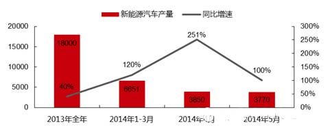根据中国汽车工业协会的数据,2013年国内共销售新能源汽车约1.8万辆,同比增长超过40%,全年销量已经超过2009年至2012年新能源汽车累计销量。而2014年以来,我国新能源汽车产销量继续提速,一季度生产新能源汽车6651辆,同比增长120%,4月份产量3850辆,同比增长251%,5月份产量3770量,同比增长接近100%。1-5月份我国新能源汽车产量合计为1.4万辆,已经接近2013年全年产量。