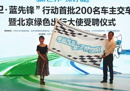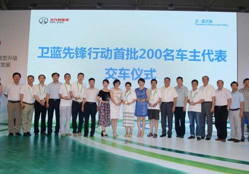 7月13日,北汽新能源公司在北京采育工厂举办仪式,向卫蓝先锋行动首批电动车主交付车辆。自6月5日北汽新能源启动了卫蓝先锋行动计划以来,一个月内已诞生200名E150EV纯电动汽车车主,订单客户更是超过800名。交车仪式举办当天,北汽新能源聘请潘晓婷、顾俊、高敏、杨凌等世界冠军担任“北京绿色出行大使”,并宣布成立以潘晓婷为队长的国内首支纯电动汽车女子特技表演队。