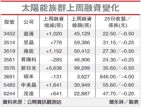 新日光、昱晶、茂迪、益通、升阳科等电池厂受此次美方课征重税影响最大,上周一度传出业者遭课税率偏低,市场出现押宝行情,根据统计,上周融资除硕禾和升阳科逆势减少外,其余个股融资都增加,以新日光大增5,636张最高,此次利空超乎市场预期,今天恐出现失望性卖压。