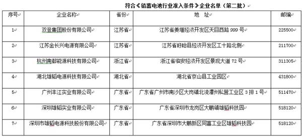 为推动铅蓄电池行业可持续发展,依据《铅蓄电池行业准入条件》,工业和信息化部、环境保护部开展铅蓄电池企业准入管理。经企业申请、省级工业和信息化主管部门初审、专家审核以及网上公示等程序,7家企业列入《符合<铅蓄电池行业准入条件>企业名单(第二批)》,现予以公告。