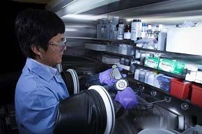 图为路小川在手套箱中组装钠电池。太平洋西北国家实验室提供