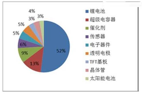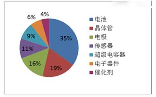 这是来自北京国之专利预警咨询中心的数据,从专利应用分布可以看出,有锂电(动力电池)、超级电容器、微电子、触摸屏、催化剂、太阳能电池等。先看锂电没有大的突破。图3.