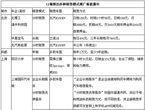 近期,各地新能源汽车推广方案纷纷出台,多数城市明确表示将探索租赁模式推广新能源汽车。目前,北京、上海、杭州、芜湖、成都、宁波等11城已开始推行电动汽车租赁模式。同样,上汽、北汽、康迪等汽车企业也在大力推广。