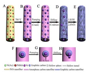 为了获得同时具有高石墨化度和大比表面积的碳纳米纤维,合作双方经过共同努力,利用纳米镍颗粒在无定形碳纤维基体中的催化石墨化原理,结合静电纺丝和化学活化技术,设计和制备了具有丰富石墨化隧道的“N-掺杂活化碳纳米纤维”(ANHTGCNs)。该材料作为锂离子电池负极材料时,具有高达1560 mAh/g的比容量,是目前商用石墨负极的4倍多,同时表现出优异的循环与倍率性能。这种通过控制金属颗粒的扩散路径来调节无定形碳石墨化结构的方法,为具有特殊石墨化结构的一维碳纳米材料制备提供了一条全新的思路。