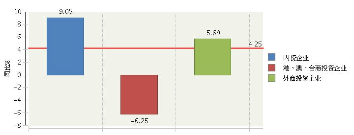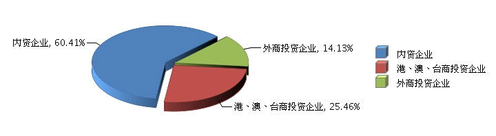 从企业注册类型看,内资企业主营业务收入占比较大。内资企业完成累计主营业务收入1193.16亿元(占60.41%),同比增长9.05%;港、澳、台商投资企业完成累计主营业务收入502.86亿元(占25.46%),同比增长-6.25%;外商投资企业完成累计主营业务收入279.12亿元(占14.13%),同比增长5.69%。(参见图3、图4)