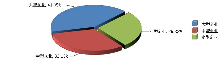 从企业规模看,小型企业增长速度加快。大型企业完成累计主营业务收入810.75亿元(占41.05%),同比增长-2.02%;中型企业完成累计主营业务收入634.63亿元(占32.13%),同比增长2.1%;小型企业完成累计主营业务收入529.76亿元(占26.82%),同比增长18.91%。(参见图5、图6)
