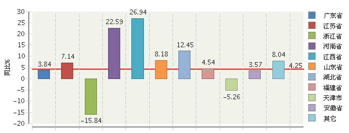 图10 :2014年1~6月全国电池行业累计主营业务收入主要地区同比增长情况