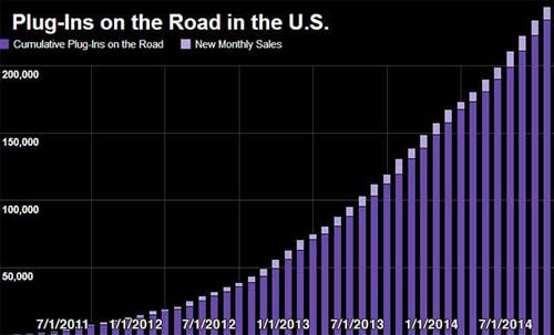 2014年,插电式电动车占据了美国汽车销售总量的约1.5%。虽然这一比例依旧不高,但是市场份额的增加值已经超出了预期。按照这一趋势,插电式电动车将会在本世纪末成为市场主角,超越燃油汽车。