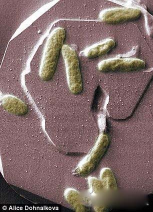 通过显微镜看到,海洋细菌希瓦氏菌的合成版本与碳电极发生互动
