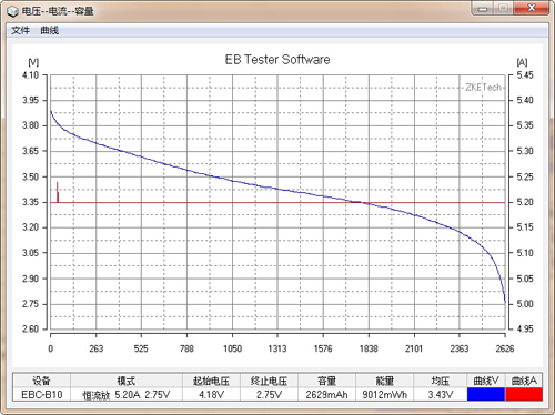 可以看到即使是2C(5.2A)大电流放电,力神2600的容量依然达到2600mAh以上,且与1C容量相差无几,证明力神2600的大电流放电性能十分优异。