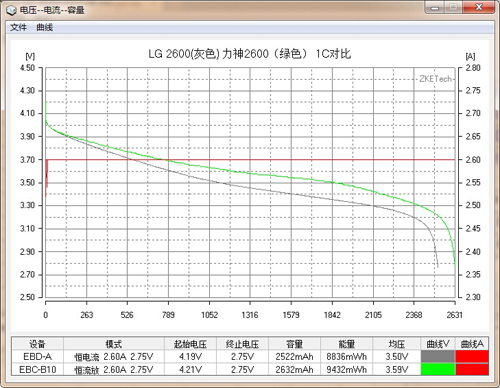 再对比一下LG 2600和力神2600的1C(2.6A)放电曲线。可以发现,力神2600的放电性能完全不逊色于LG 2600mAh 18650,甚至还显著高于LG 2600。得益于力神的电压平台更高,虽然都是2600mAh,但能量明显要高于LG。