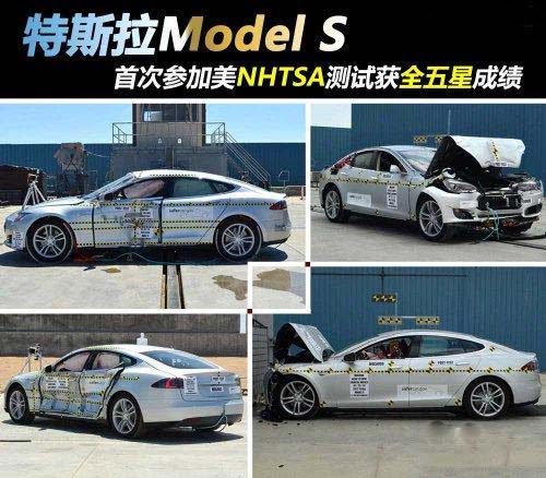 特斯拉在NHTSA(美国高速公路安全协会)进行了数次碰撞测试,包括100%正面碰撞、27°角侧面碰撞、75°角侧面柱碰和翻滚碰撞、车顶强度等碰撞测试。在100%正面碰撞测试中,由于特斯拉汽车“发动机舱”内不需要安装动力总成,有足够的空间来安排提高车身强度的结构,可以更好地保护乘员舱及车身下方的电池组。由于电池分布在车底,电机位于后车桥,前部没有动力总成,整车的重量基本都集中在车辆底部和尾部并且重心较低,所以在正面碰撞测试中,车尾并没有出现大幅度抬起的情况。