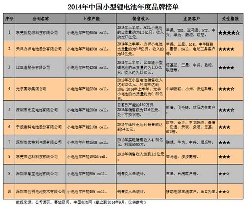 从2014年第二届中国(成都)锂电新能源产业国际高峰论坛(ABEC2014,锂电“达沃斯”)组委会获悉,28日中国电池网、赛迪顾问等机构联合推出了2014年度中国小型锂电池年度品牌榜单,该榜单根据我国小型锂电池企业的产能数据、客户分布、公司情况、诚信形象等得出,数据来源为公司调研和机构数据(数据统计截止到2014年9月,仅供参考)。上榜企业由赛迪顾问锂电产业研究小组进行了专家点评。