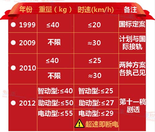 自2002年中国轻工业联合会下达了GB17761-1999《电动自行车通用技术条件》国家标准的修订任务(以下简称新电动自行车标准)以来,并要求2003年完成。迄今共经12年新国标一直迟迟未出,但其挑逗却从未终止过,其中,关于新国标中里程时速的标准也是几经更改,如下图所示: