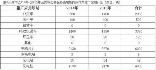 天津市计划到2015年底重点在公交车、出租车、邮政快递车、环卫车等领域分三年累计推广应用新能源汽车6000辆,其中公交车2000辆,出租车500辆,邮政快递车3380辆、环卫车120辆。