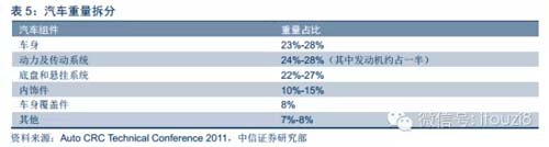 汽车车身:高强度钢板是当前主流,碳纤维材料在F1及超级跑车中已有应用。轿车车身占轿车自重的30%,高强度钢板厚度分别减少0.05、0.1和0.15mm时,车身减重分别为6%、12%和18%。而从成本方面考虑,一般的高强度钢板单件均价相比普通钢板件高10%-25%,而零件厚度可以比普通钢板减薄10%-20%,因此在汽车上使用高强度钢板成本基本不变。碳纤维车身质量轻、强度高,技术优势明显,但由于成本较高,目前仍主要应用于赛车和跑车上,例如瑞典超级跑车柯尼塞格(KoenigseggCCXR)采用了轻量化的全碳纤维车身钢制副车架,全车净重仅1180公斤。宝马将碳纤维作为公司轻量化的主要技术研发方向,目前已推出的宝马i3和i8采用了大量碳纤维材料,预计在未来1-2年内将实现纯碳纤维轮毂、方向盘等部件的量产,并逐渐应用到更多车型上。