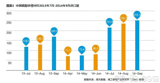 新能源汽车销量销售38163辆,比2013年同期增2.8倍,直接拉动磷酸铁锂的需求,但国内磷酸铁锂材料制造商享受的红利有限。主要原因有:(1)国内动力电池巨头自主生产磷酸铁锂,外部采购量有限,如比亚迪、国轩高科等;(2)进口磷酸铁锂的性能优势,中高端电芯厂趋于采购国外的磷酸铁锂,因此第三季度国内磷酸铁锂进口量增长较大。2014年第三季度中国进口磷酸铁锂704吨(图表2),同比增长68.4%,环比增长210%。