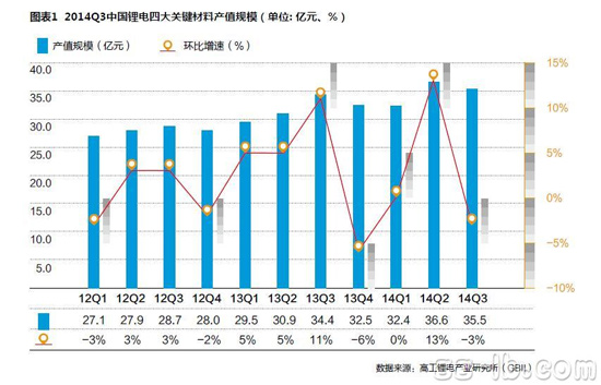2014年第三季度国内锂电四大关键材料产值规模为35.47亿元(图表1),环比下降3%。四大材料中,除了隔膜外,其他材料的销售额均出现环比下降。原因有:(1)下游应用市场,除了新能源汽车,3C与储能市场在第三季度表现一般,导致销量环比下滑;(2)由于四大材料的产能均严重过剩,供大于求,价格持续下滑。