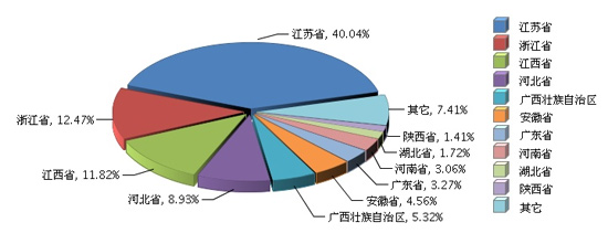 根据国家统计局公布数据,全国太阳能电池行业累计完成产量3,382.47万千瓦,同比增长27.30%。比重主要集中在江苏、浙江、江西、河北、广西、安徽地区。其中:江苏省完成累计产量1354.47万千瓦(占40.04%),同比增长28.29%;浙江省完成累计产量421.87万千瓦(占12.47%),同比增长30.25%;江西省完成累计产量399.77万千瓦(占11.82%),同比增长-6.32%;河北省完成累计产量301.98万千瓦(占8.93%),同比增长21.17%;广西壮族自治区完成累计产量179.8万千瓦(占5.32%),同比增长88.43%;安徽省完成累计产量154.34万千瓦(占4.56%),同比增长178.12%。