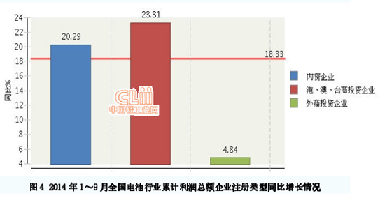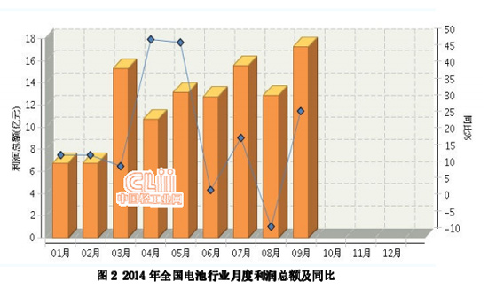 2014年1~9月,全国电池行业累计完成利润总额同比增长18.33%。其中:9月份完成利润总额17.22亿元,同比增长28.2%。(参见图2)