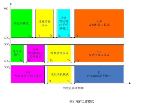 图2是两种典型的PHEV动力系统结构,比亚迪秦与图2左图相同。笔者研究团队制定了图2结构的工作模式,如图3所示,根据蓄电池SOC和驾驶员需求扭矩(根据踏板开度和车速解析获得),即可确定出PHEV的工作模式,纵轴SOC和横轴需求扭矩之间白色带宽是为了防止工作模式的频繁跳变。图3中SOC1和SOC2在30%左右,SOC3和SOC4在10%左右;SOC大于SOC1以及处于SOC2和SOC3之间的工作模式是最常用的工作模式,可使电池SOC基本维持在30%左右;设置SOC3和SOC4的目的是为了考虑“Auto”和“HEV”模式下,低速纯电动和需求扭矩大(爬陡坡和急加速)等特殊工况的动力需求;但当SOC低于10%时电池不能放电,一方面由于此时电池放电效率低,另外由于电池SOC误差较大(可达8%)、此时电池已经处于无电状态。