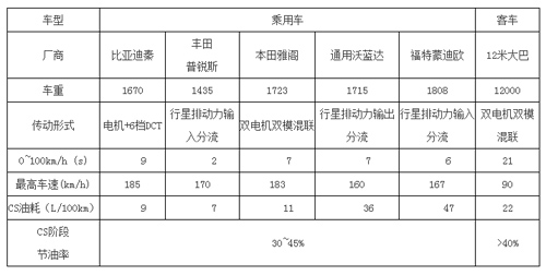 搜集了国内外主流乘用车和客车PHEV的技术参数,如表2所示,可以看出各主要厂商PHEV在CS模式的节油率均大于30%,PHEV客车节油率高达40%以上,即表明不充电状态下节油率仍然较高。