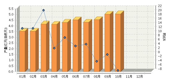 2014年1~10月,全国锂离子电池行业累计完成产量43.56亿只(自然只),同比增长4.56%。其中:10月份完成产量5.05亿只(自然只),同比增长-7.48%。