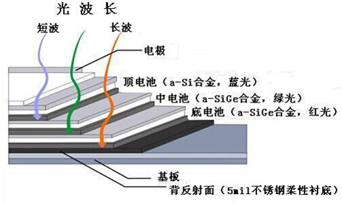 在传统的非晶硅电池中,分为单结,双结,三结,甚至还有5结之多。但是综合成本考虑,比较多用的是3结结构。所谓的3结结构,就是分为三层吸光层,各吸收不同的太阳光谱波段。他采用P.I.N综合多层制造以降低光感反射效应,而P.I.N又是主要导电层,因此由非晶质与锗元素等材料结构,使带隙空特性来调和能量转换率可达8.6%左右。太阳能谱辐射电场范围涵盖X光辐射及珈码辐射其波长有: