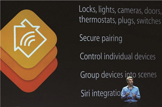 △ 苹果智能家居。2014年6月,苹果公司宣称,最新设计的“HomeKit”智能家居平台可实现通过智能手机远程控制,同时,该平台支持的产品线更为广泛,例如:灯、门、温度调节装置、开关。