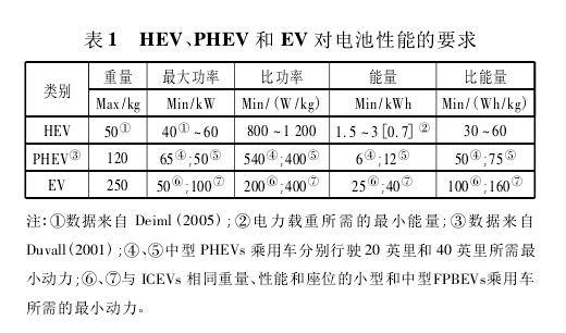 由于不同类型新能源汽车中,车用动力电池的使用方式有较大区别,因此对于其性能要求有较大区别。HEV有汽油发动机作为动力来源,更强调加速性能和爬坡能力,因此更注重电池的比功率(要求高达800一1 200 W / kg);PHEV和EV完全以电池作为动力,更强调充电后的续驶能力,因而更关注电池的比能量(要求达到100一160 Wh/kg)(见表1)。