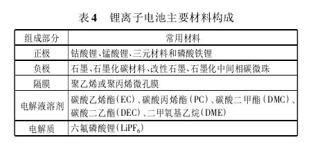 铿离子动力电池主要由正极材料、负极材料、电解液和电池隔膜4部分组成(见表4)。