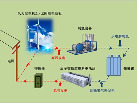 作为地球上最轻的元素,氢具有最高的能源密度,可以通过电将水分解产生。如果水电解槽与风力发电或太阳能电池板集成,氢气作为能量储存的媒介可由多余的风力、太阳能发电产生。在电网高峰时段,质子交换膜(PEM)燃料电池站发电来满足电网要求。由于PEM燃料电池发电过程不涉及氢氧燃烧,因而不受卡诺循环的限制,能量转换率高;发电时不产生污染,发电单元模块化,可靠性高,组装和维修都很方便,工作时也没有噪音。所以,质子交换膜燃料电池电源是一种清洁、高效的绿色环保电源。