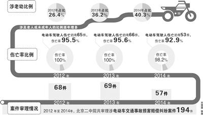 北京二中院分析发现,涉电动车交通事故损害赔偿纠纷案件中,涉及老人或未成年人的比例逐年增多:2012年为26.4%,2013年为36.2%,2014年为40.3%。